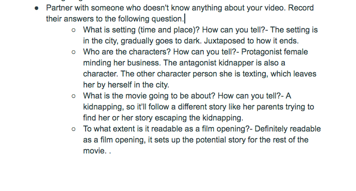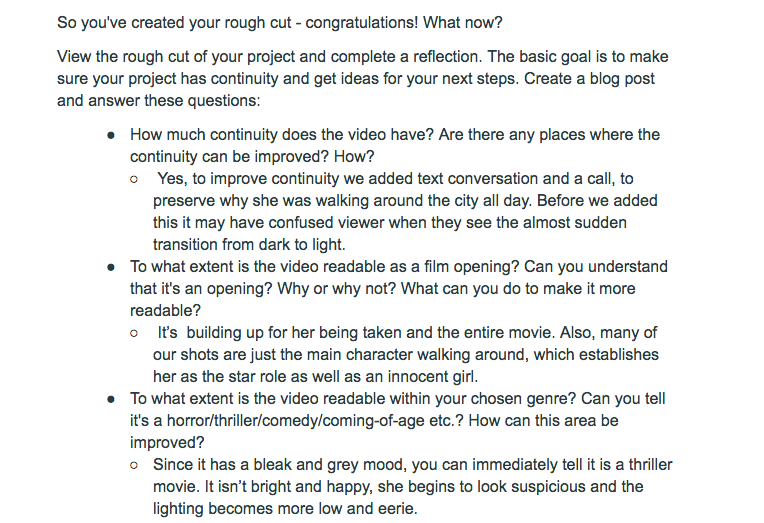While my partner was the cinematographer and took charge of filming with her iphone, I was in charge of close-up shots due to her hands being to shaky to get a quality shot. I directed the film by deciding what kind of shots would best communicate the tone and message we were trying to send. This included explaining to her what angles and distances would look better and attempting to visualize our original screenplay. For most of the production process she would film a few seconds of Jenna acting out a scene, and I would decide if we needed the same shot from another perspective. My partner recorded all the ambient sounds for the film and decided where to put them. I also chose the font styles for our movie, and spent several days researching various soundtracks which we could overlay and put into our film. After finding several quality videos of suspenseful sounds, I showed them to my partner and we agreed on how to edit them in. While me and my partner had an equal say in all the editing decisions, she was the official editor because she is more accustomed iMovie and has the most knowledge on how to use the tools it makes available. Costuming was something me and my partner decided together, but she was the production designer as well because of her role in figuring out other areas of mise-en-scene, such as blocking, framing and lighting.