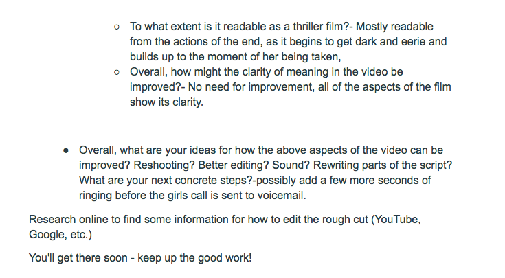 When working with the shorter clip, we only used the first 15 seconds for the last part of our film because this had the most dramatic effect. These few seconds featured a very dramatic rise in pitch and was perfectly matched with our female protagonists scream.