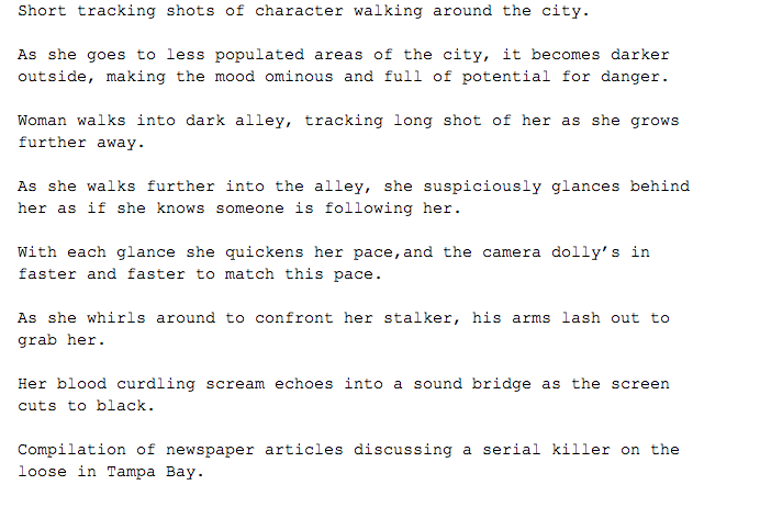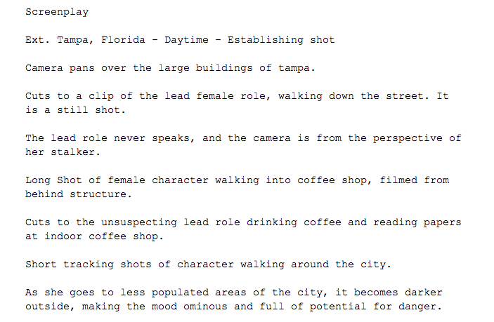 Below is a general screenplay and scripting for our movie. Since there is no dialogue in our film, we wrote a general script and screenplay of the shots and her actions throughout the clip. They may vary in our actual opening sequence because of formatting.